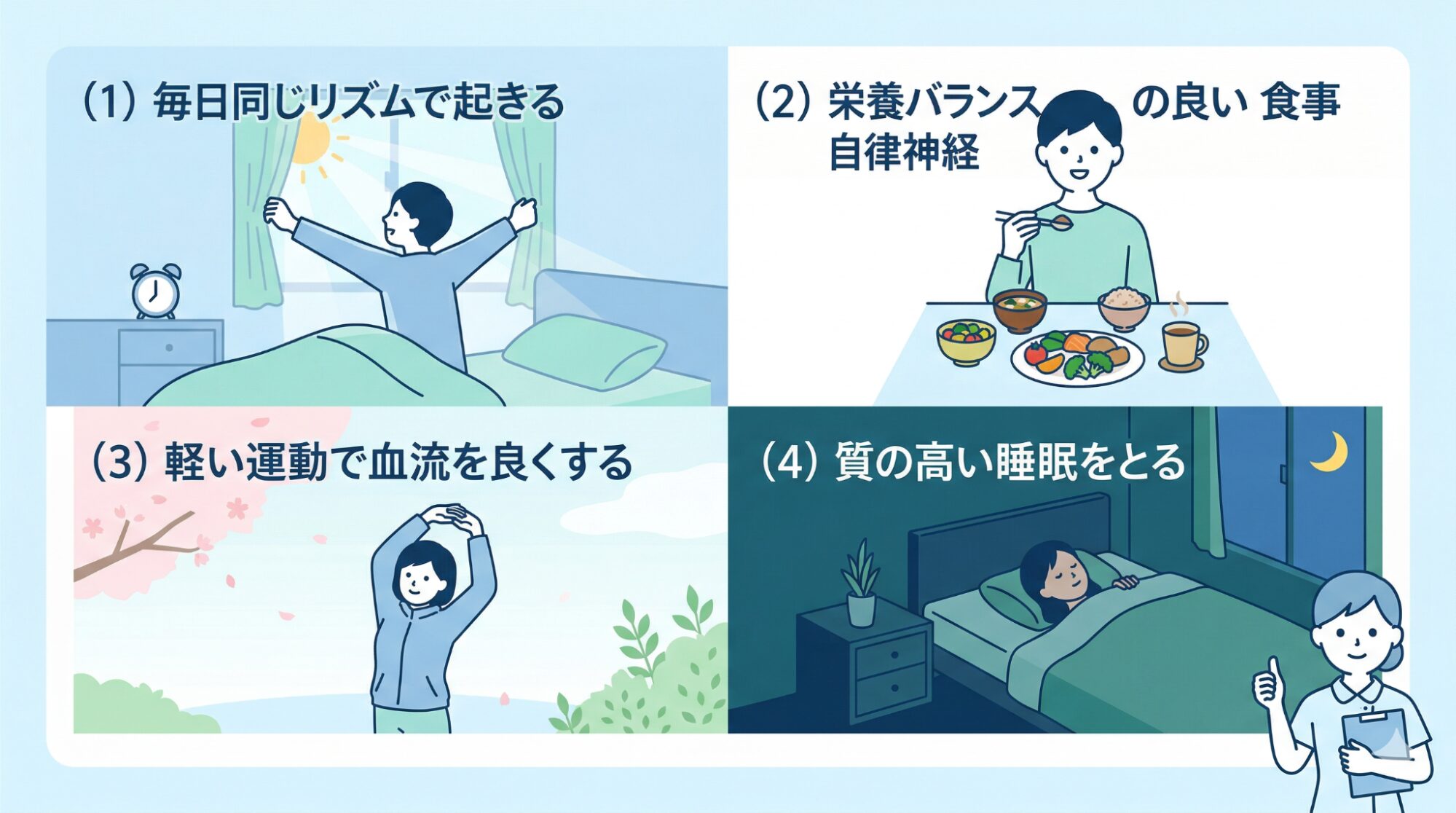 睡眠不足は自律神経の乱れを悪化させるため、ぐっすり眠れる環境を整えましょう。